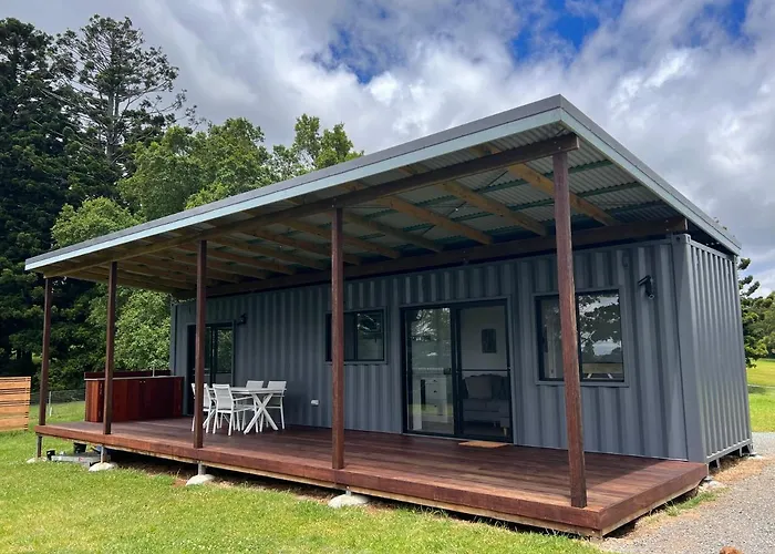 Die Three Pines House - Unique Tiny House With Views verfügt über eine Terrasse mit Blick aufs Meer und ist 53 Autominuten vom Flughafen Gold Coast entfernt gelegen.